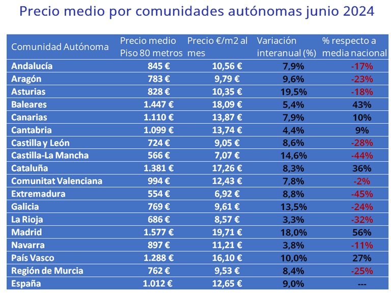 Si se analizan al detalle los precios de las comunidades autónomas se observa que seis de ellas también superan los 1.000 euros al mes, como ocurre con la media nacional española. En primera posición se encuentra la Comunidad de Madrid, donde alquilar un piso de 80 metros cuadrados cuesta, de media, 1.577 euros mensuales convirtiéndose en la autonomía con el precio del alquiler más alto de España, con un precio por metro cuadrado de 19,71 €. La segunda plaza la ostenta la Comunidad Balear, donde de media un piso cuesta 1.447 euros al mes, con un precio medio por metro cuadrado de 18,09 €. En tercer lugar, se encuentra la Comunidad de Cataluña con un precio medio de 1.381 euros al mes por una vivienda de 80 metros (17,26 €/m2).