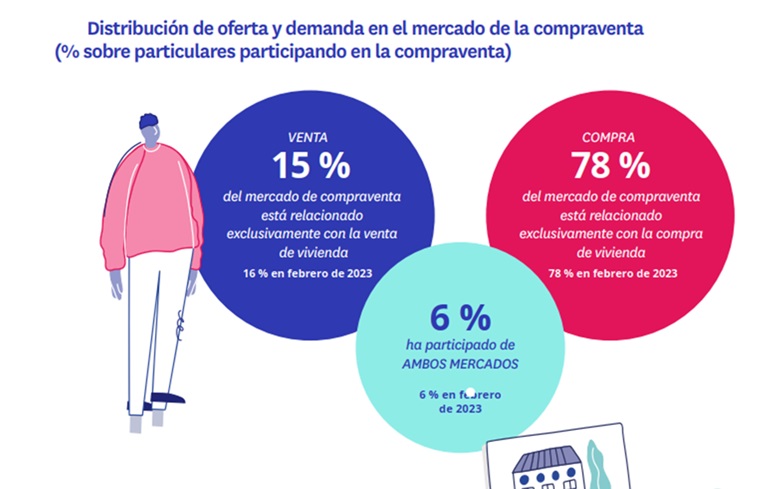 Si estos datos se trasladan al global de la población española mayor de 18 años, se observa que en el último año un 14% de españoles ha comprado o está intentando comprar frente al 4% de propietarios que vende o está intentando vender. Este 14% se mantiene estable frente al año pasado, pero baja dos puntos porcentuales respecto a hace dos años, momento en que empezó la subida de tipos de interés. Por su parte, el número de propietarios que vende se mantiene estable desde 2022.