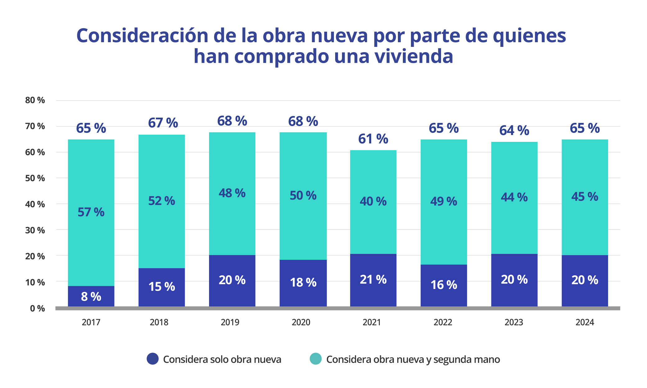 Las cifras de 2024 también dejan el porcentaje de los compradores que contemplan adquirir exclusivamente obra nueva en el mismo 20% del año anterior, después de que en 2022 fueran únicamente el 16%.