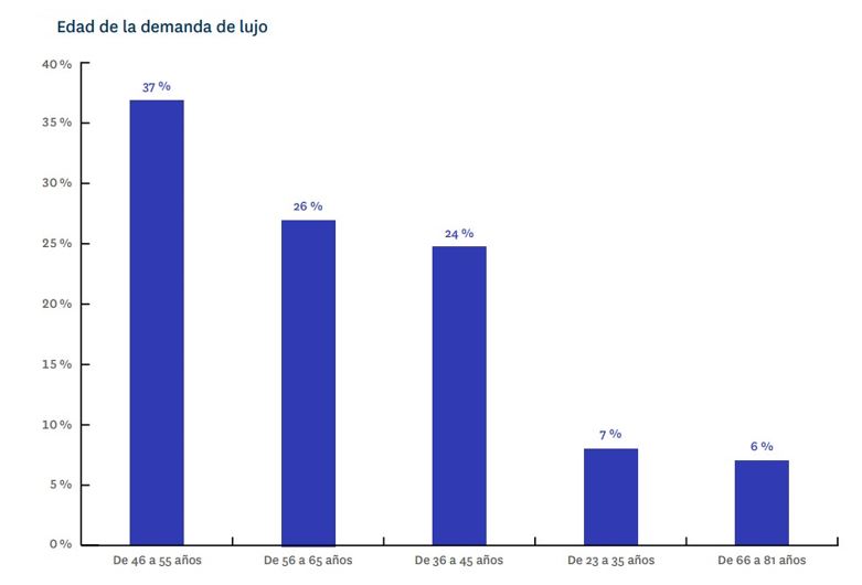 Según los datos analizados por INFINITUM, a nivel demográfico, la vivienda de lujo genera mayor demanda de forma generalizada entre las personas de mediana edad. Así, el grupo de entre 46 y 55 años representa el 37% de la demanda de inmuebles residenciales de alto standing. Más de diez puntos porcentuales por debajo se encuentran las dos cohortes de población siguientes: las personas entre 56 y 65 años, que concentran el 26% de los demandantes, y el grupo entre 36 y 45 años, que representa el 24%. En las últimas posiciones, los solicitantes de este tipo de viviendas de lujo que tienen entre 23 y 35 años son el 7% del total, el mismo porcentaje que el grupo entre 66 y 81 años.