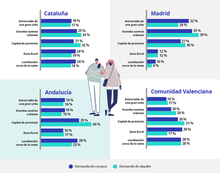 Estas relaciones entre lugares de residencia y zonas de búsqueda de vivienda también tienen una variable territorial.Así, Madrid registra unos porcentajes de demandantes de vivienda que buscan en grandes centros urbanos, capitales de provincia y extrarradio muy superiores al resto. Y, sin embargo, por razones obvias, las búsquedas en zonas rurales o cercanas a la costa son menos significativas.En Cataluña, los porcentajes son más moderados, aunque el alquiler destaca especialmente en la demanda en los grandes centros urbanos y las capitales de provincia. Mientras que, en la costa, las zonas rurales y el extrarradio tiene más protagonismo el alquiler.