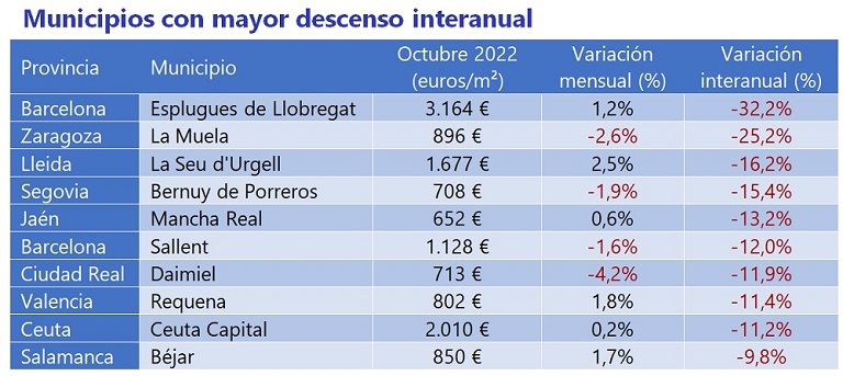 En cuanto al precio por metro cuadrado en octubre, vemos que el orden de las ciudades más caras es: Donostia – San Sebastián con 5.681 euros/m2 y La Moraleja con 5.359 euros/m2. Por otro lado, el municipio más económico es Alguazas (Murcia) con un precio de 617 euros el metro cuadrado.