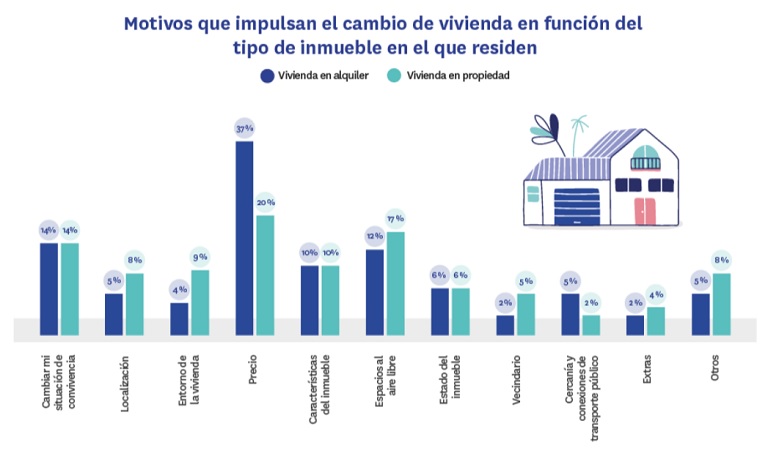 Dejando a un lado el precio, en ambos targets existen motivos similares por los que ahora se plantean o podrían plantear un cambio de vivienda. Cambiar la situación de convivencia, la búsqueda de espacios al aire libre como terrazas o jardines y las características del inmueble (metros cuadrados, distribución, etc.) son las principales motivaciones para ambos grupos de población.