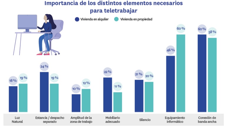 Además, los que viven de alquiler valoran más tener una estancia independiente para trabajar (24% frente al 19 % de los que viven en propiedad) y tener mobiliario acorde para el teletrabajo (22% frente al 11%).