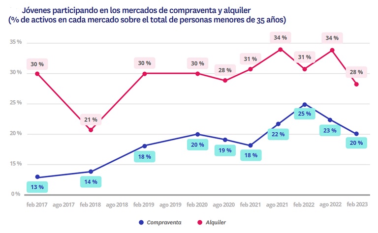 Si distinguimos entre compraventa y alquiler, se comprueba que ambos mercados descienden, pero en mayor medida el primero, ya que su actividad entre los jóvenes se rebaja del 25% de febrero de 2022 al 20% del mismo mes de 2023. Es decir, una pérdida de cinco puntos porcentuales, lo que lo sitúa cerca del 18% de 2021. Este retroceso refleja que, tras un periodo en el que la adquisición de vivienda en propiedad, o su intención de hacerlo, ganó terreno entre los jóvenes, se ha replegado hacia los valores anteriores.