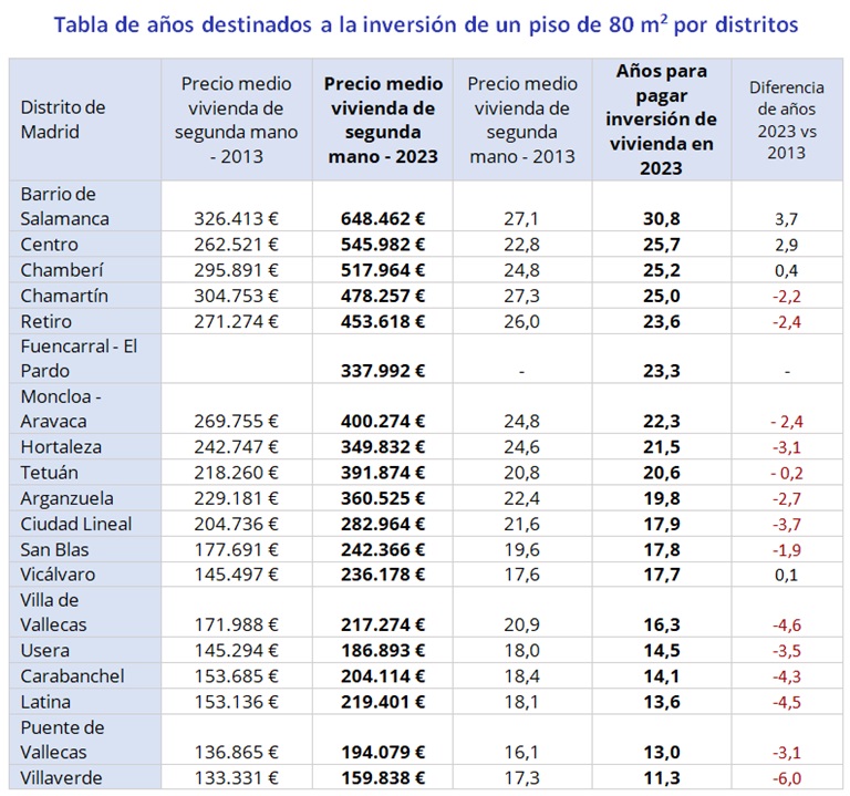 En 2023 los compradores de una vivienda de inversión en Barrio de Salamanca tardarán una media de 30,8 años (frente a los 27,1 años de 2013) en pagar lo invertido (648.462 euros) por un piso de 80 metros cuadrados, según el estudio de Fotocasa. Por otro lado, los compradores de una vivienda similar en el distrito de Villaverde recuperarán lo invertido (159.838 €/m2) en 2023, en apenas 11,3 años (frente a los 17,3 años de 2013).