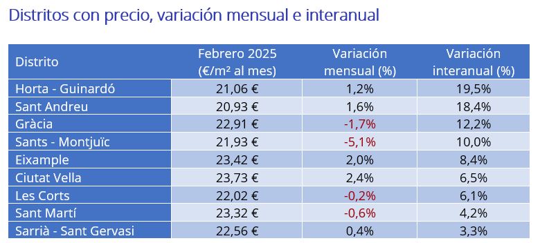 El precio del alquiler sube en febrero en los diez distritos respecto al año anterior. Los distritos analizados con incremento interanual son: Horta – Guinardó (19,5%), Sant Andreu (18,4%), Gràcia (12,2%), Sants – Montjuïc (10,0%), Eixample (8,4%), Ciutat Vella (6,5%), Les Corts (6,1%), Sant Martí (4,2%) y Sarrià – Sant Gervasi (3,3%).