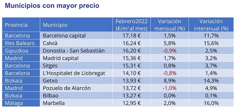 En cuanto al precio por metro cuadrado en febrero, vemos que 26 municipios sobrepasan los 10,00 €/m2 al mes y los diez con mayor precio son:Barcelona capital con 17,18 €/m2 al mes, Calvià con 16,24 €/m2 al mes, Donostia – San Sebastián con 16,20 €/m2 al mes, Madrid capital con 15,36 €/m2 al mes, Sitges con 15,31 €/m2 al mes, L’Hospitalet de Llobregat con 14,10 €/m2 al mes, Getxo con 13,93 €/m2 al mes, Pozuelo de Alarcón con 13,72 €/m2 al mes, Bilbao con 13,27 €/m2 al mes y Marbella con 12,95 €/m2 al mes.