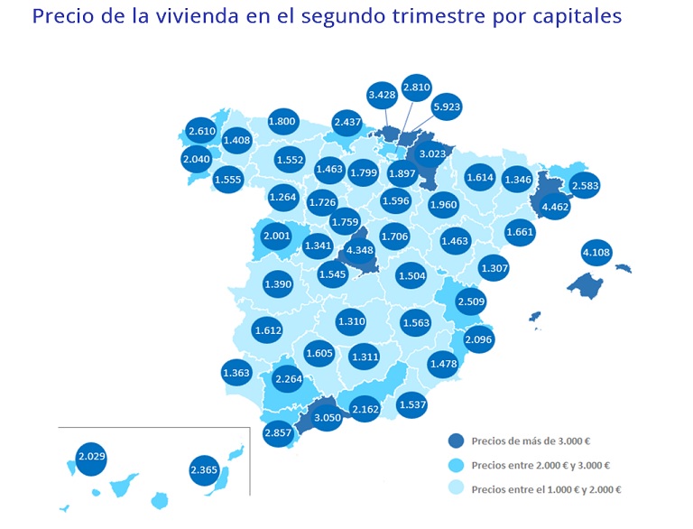 En cuanto al ranking de precios por capitales, Donostia – San Sebastián es la única que supera la barrera de los 5.000 euros, en concreto se paga por la capital vasca 5.923 euros el metro cuadrado. Le siguen las ciudades con el metro cuadrado más caro de Barcelona capital con 4.462 euros/m2, Madrid capital con 4.348 euros/m2, Palma de Mallorca con 4.108 euros/m2, Bilbao con 3.428 euros/m2, Málaga capital con 3.050 euros/m2, Pamplona / Iruña con 3.023 euros/m2, Cádiz capital con 2.857 euros/m2, Vitoria – Gasteiz con 2.810 euros/m2 y A Coruña capital con 2.610 euros/m2. Por otro lado, la ciudad con el precio más económico para comprar una vivienda es Zamora capital con 1.264 euros el metro cuadrado.