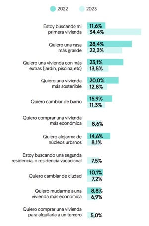 También se observa una modificación en el orden de motivaciones que empujan a la demanda de compra a buscar una nueva vivienda. Mientras que este año la búsqueda de la primera vivienda se convierte en la principal motivación entre aquellos que quieren comprar un inmueble (34,3%), la búsqueda de una vivienda más grande (28,4%) era la principal razón en 2022, aspecto que ocupa la segunda posición en esta ocasión.